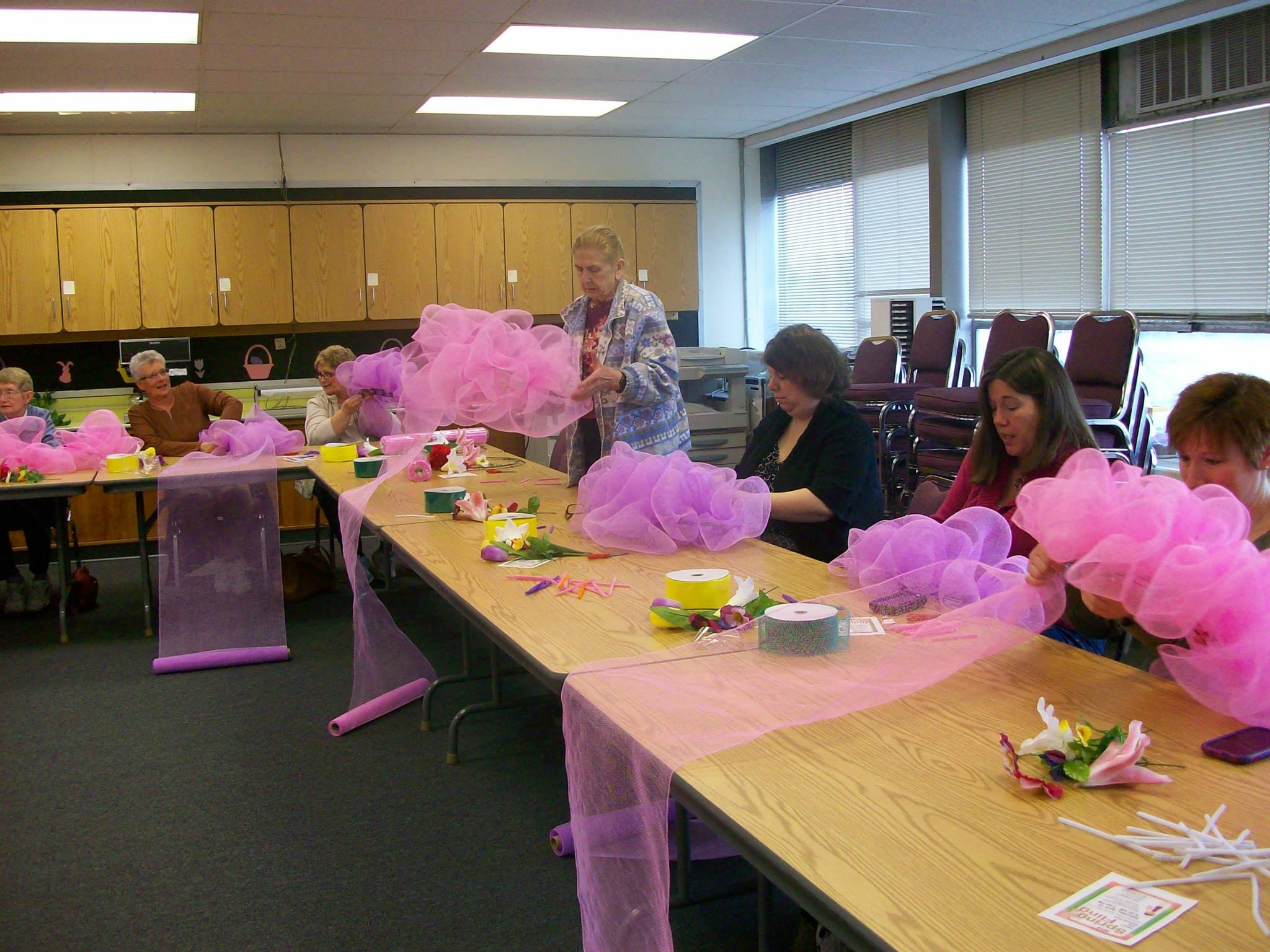 Craft club making spring wreaths.